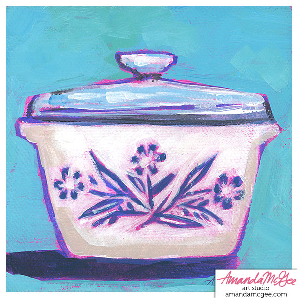 Relive your kitchen memories with the limited edition reproduction "Little Casserole" of the original acrylic painting. This vintage classic corningware dish will add a touch of nostalgia to your home and bring back all those warm and cozy feelings. Perfect for any kitchen decor.