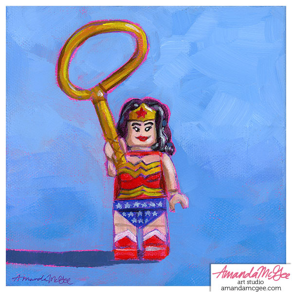 Step back into childhood with this fun limited edition reproduction of the acrylic painting "She's Wonderful" of your favorite classic woman action hero brick block toy. Vividly captured in a pop art acrylic painting, this wonderful action figure will add a playful and nostalgic touch to any room. Perfect for those powerful women who are young at heart!